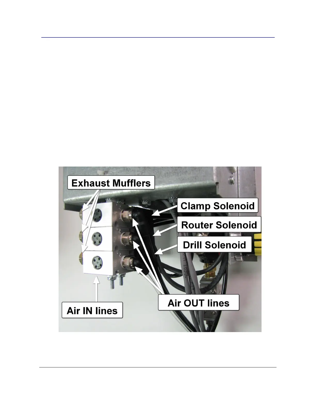 1. Open the rear door. Remove the exhaust mufflers from the Router and drill solenoids. See Fig 21.