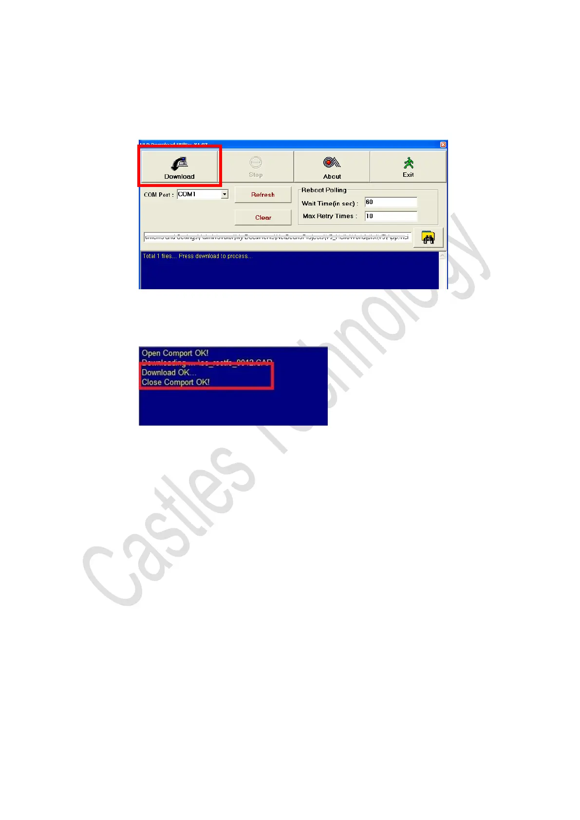 After download finish, the log screen will show “Download OK…” as the