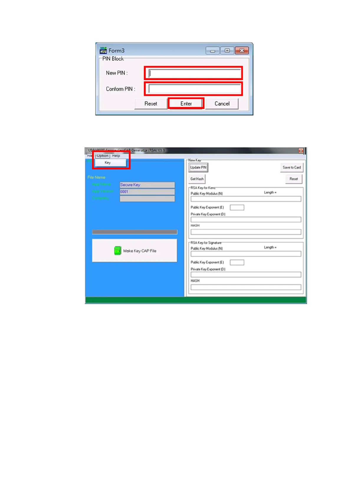 To view current key set hash value, goto “Option” and select key.
