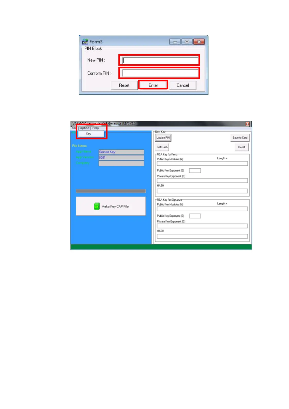 To view current key set hash value, goto “Option” and select key.