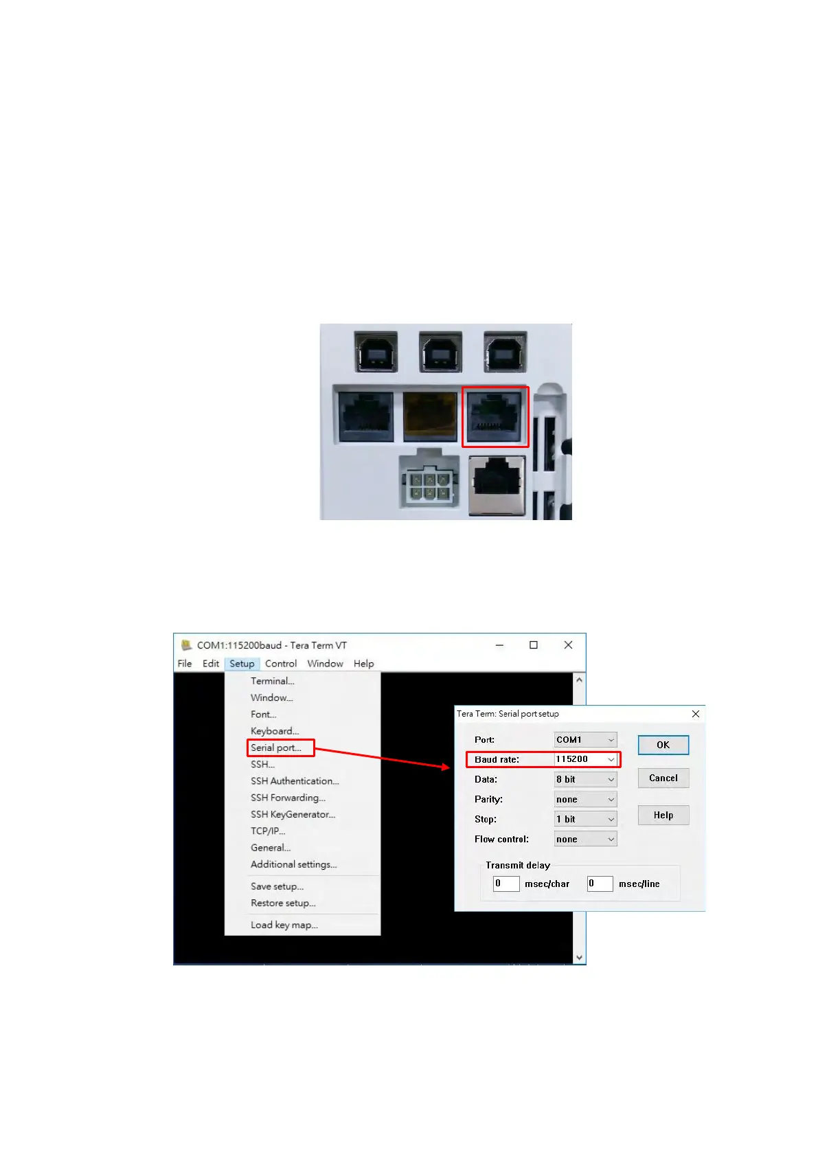 ▪ Select “Serial port” to set the com port. The baud rate should be set to