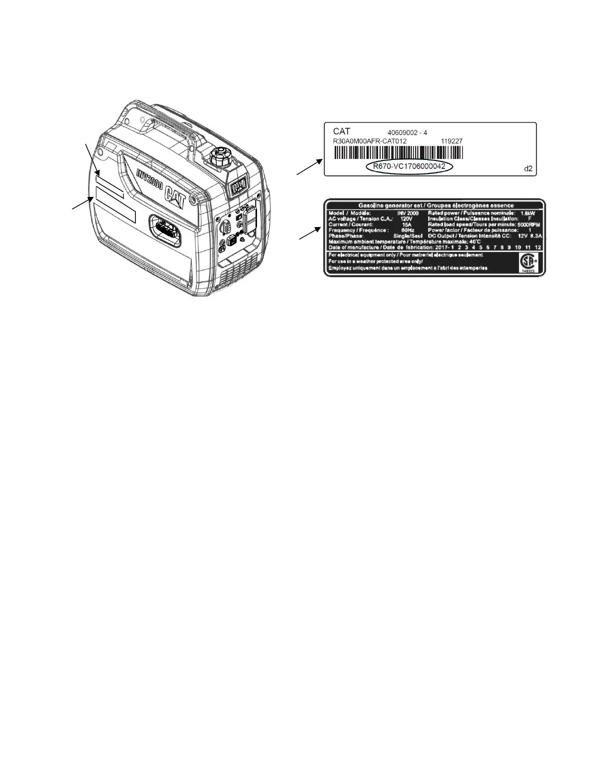 Cat® portable generators are identified with model numbers, serial numbers, and with performance