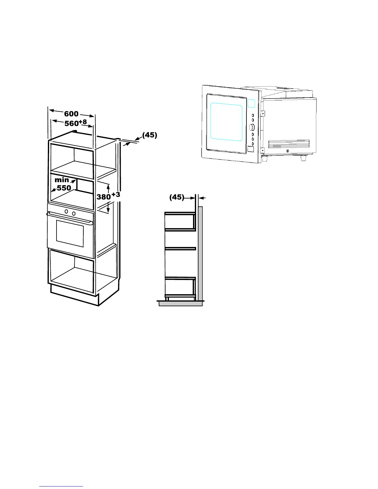 A beépített szekrénynek ne legyen hátfala a készülék mögött. A minimális beszerelési
