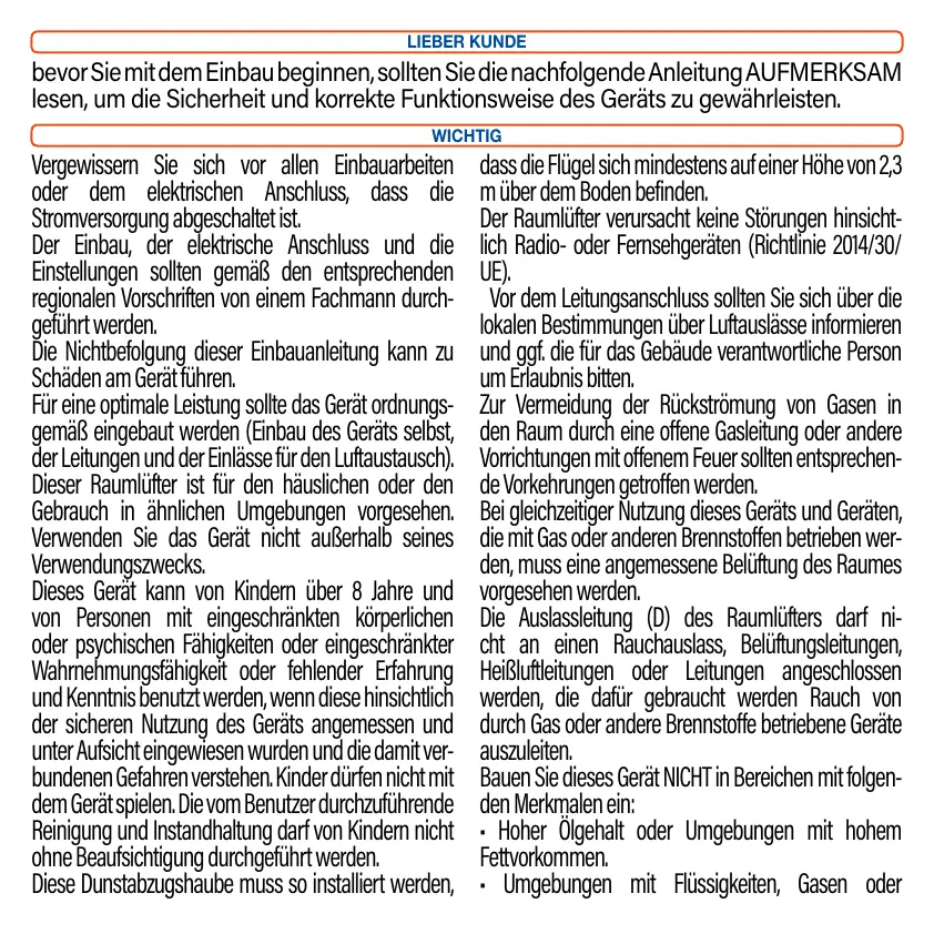Die Nichtbefolgung dieser Einbauanleitung kann zu