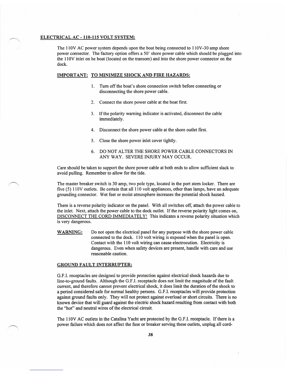 The llOV AC outlets in the Catalina Yacht are protected by the G.F.I. receptacle. If there is a