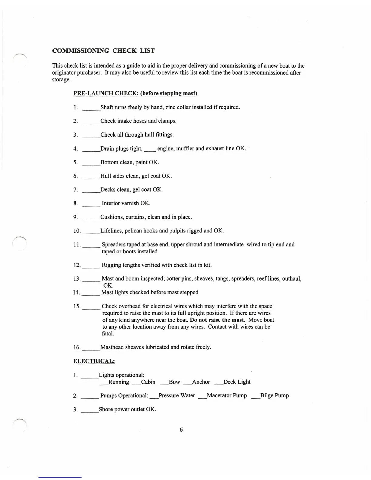 This check list is intended as a guide to aid in the proper delivery and commissioning of a new boat to the