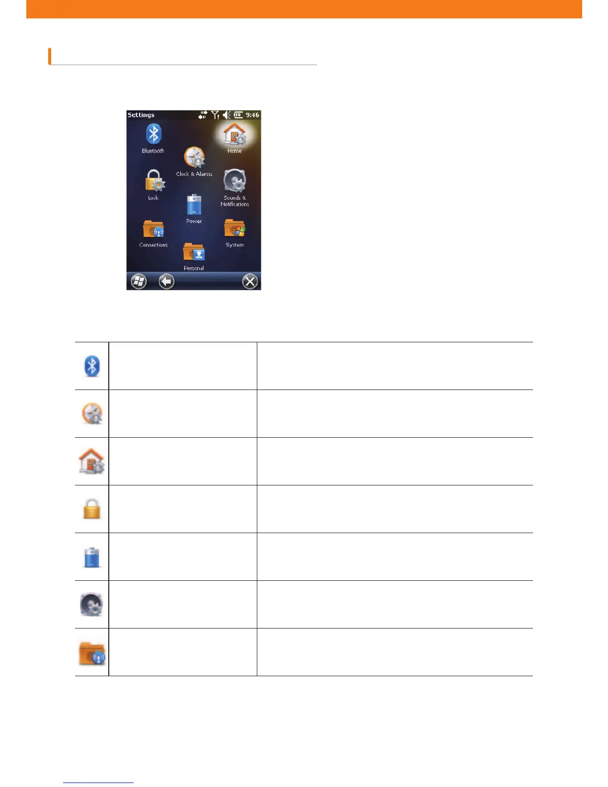 Pre-installed con¿guration applications are listed in Table 2-4. Choose Start > Settings to open Settings folder.