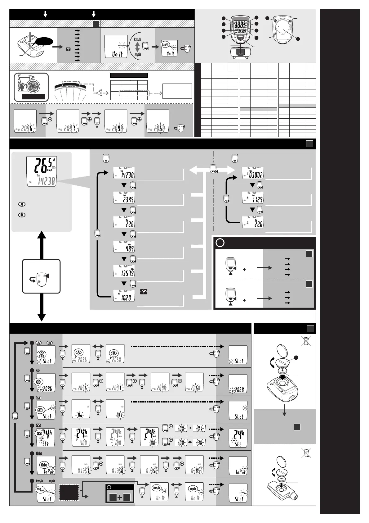 Cateye MICRO Wireless CC-MC100W - Initial Setup and Unit Configuration; Clearing Data and Selecting Units; Setting Wheel Circumference; Operation Modes and Data Display