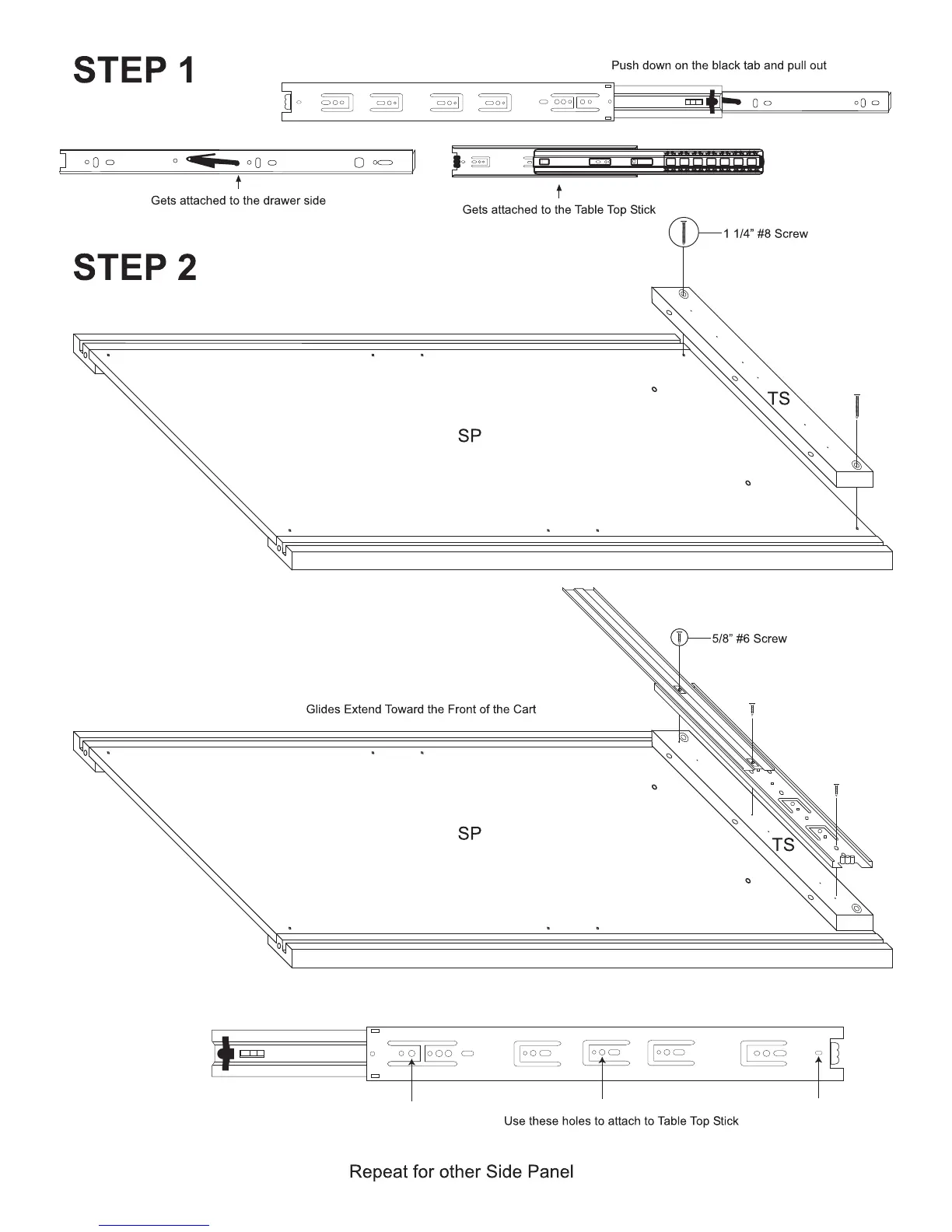 CATSKILL 63036 - Assembly Steps; Step 1: Attach Drawer Glides to Drawer Side; Step 2: Attach Glides to Table Top Stick