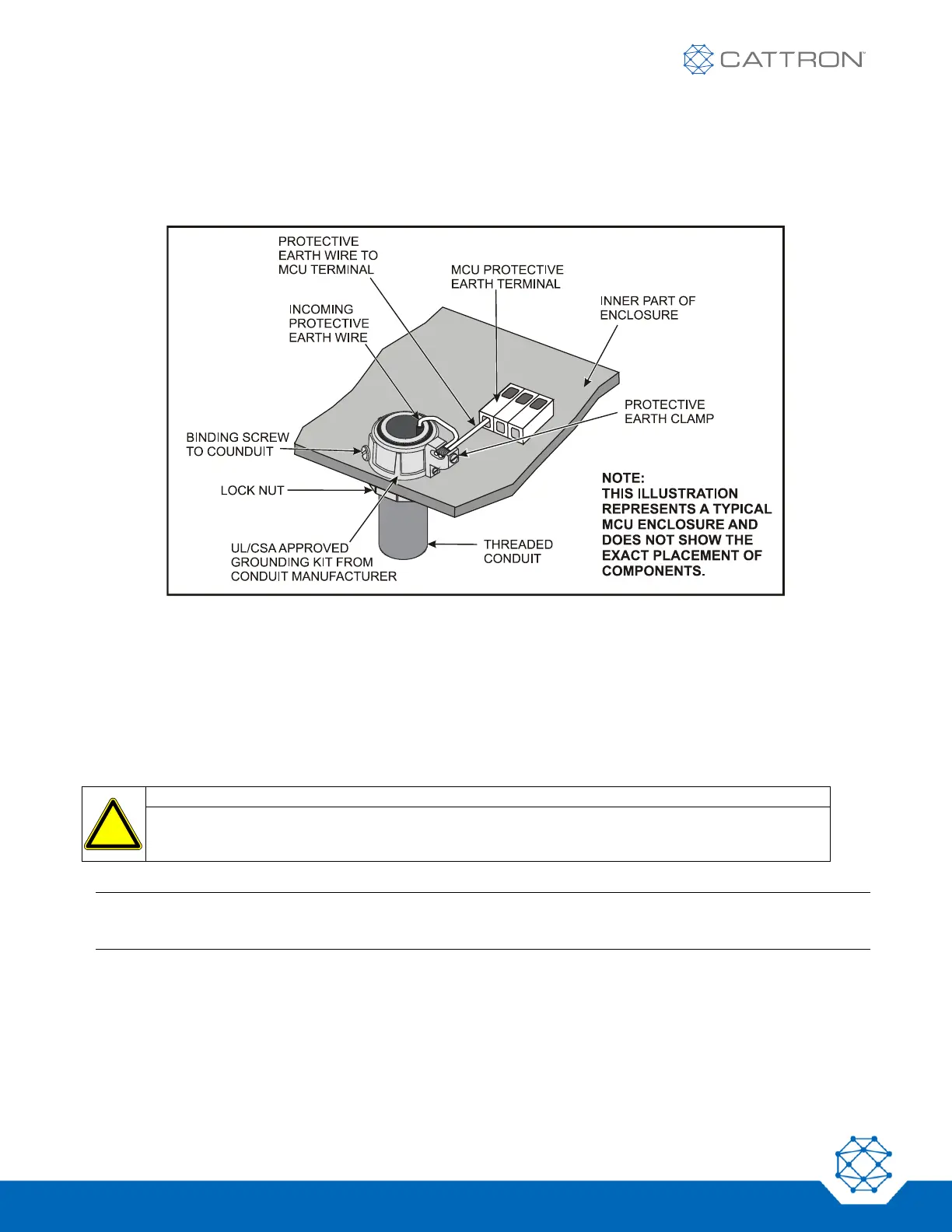 wire from the MCU PE terminal must be connected and securely fastened to the Protective Earth Clamp.