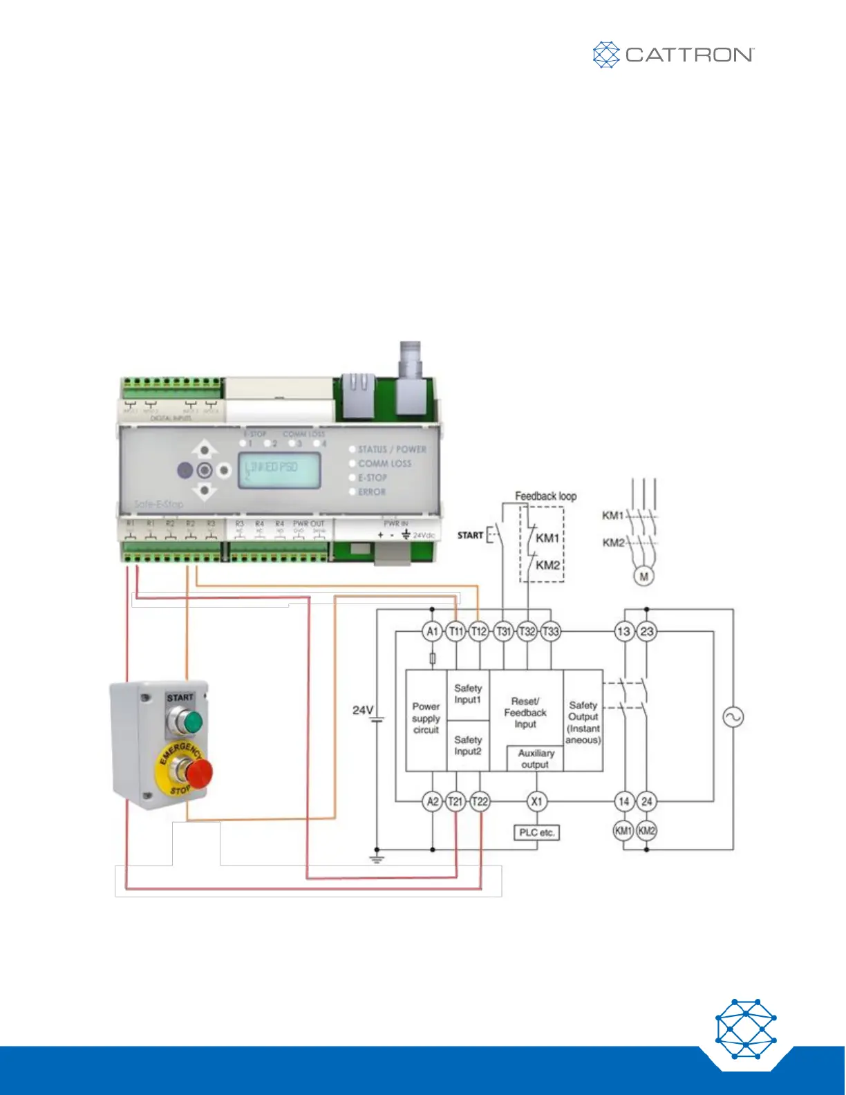 The following configuration provides the systematic capability of 3 provided by the E-Stop relays in a dual channel