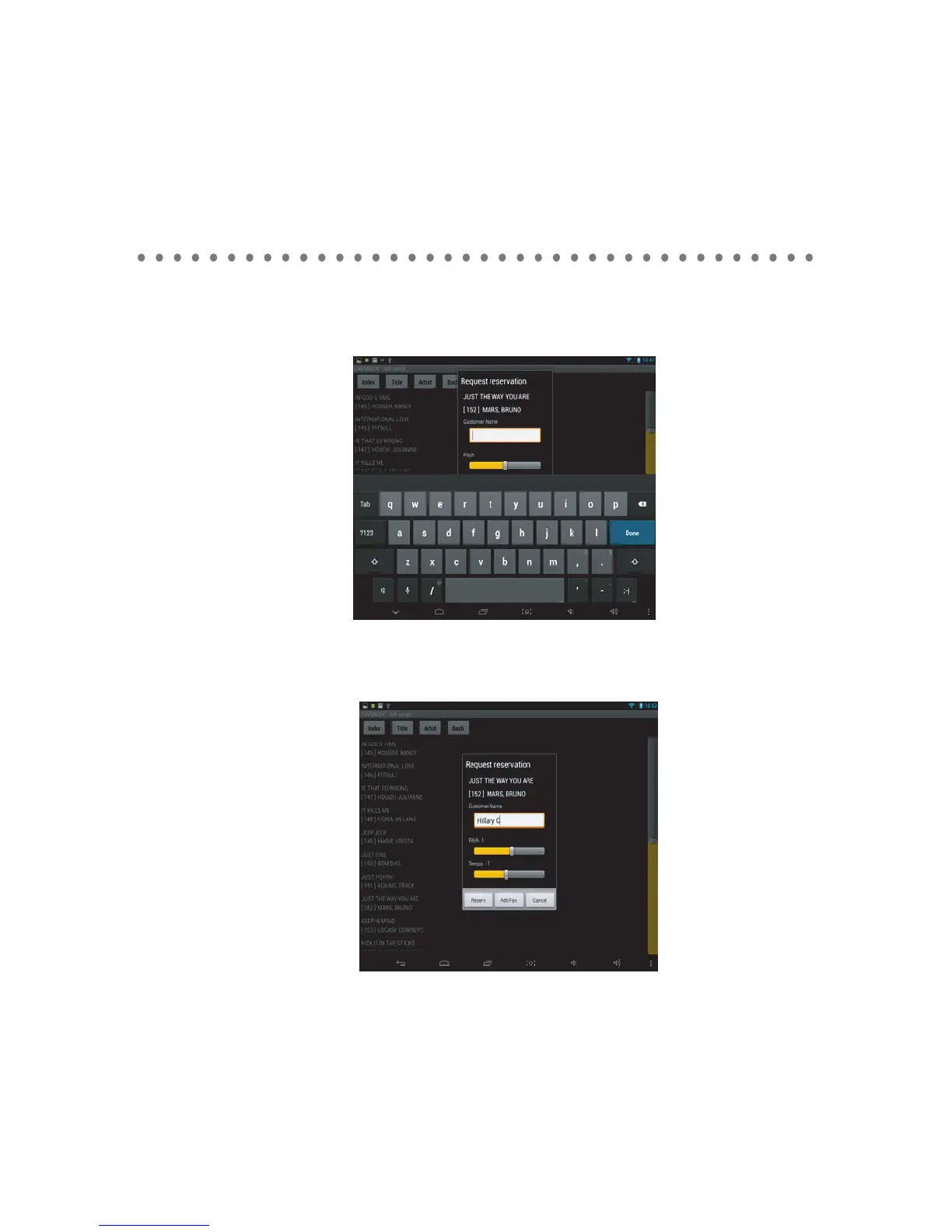 Tap on a song you wsh to select. Request reservation window will apear. Type in customer name