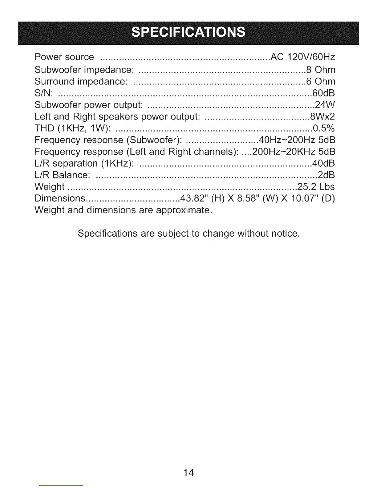 Frequency response (Subwoofer): ........................... 40Hz--,200Hz 5dB
