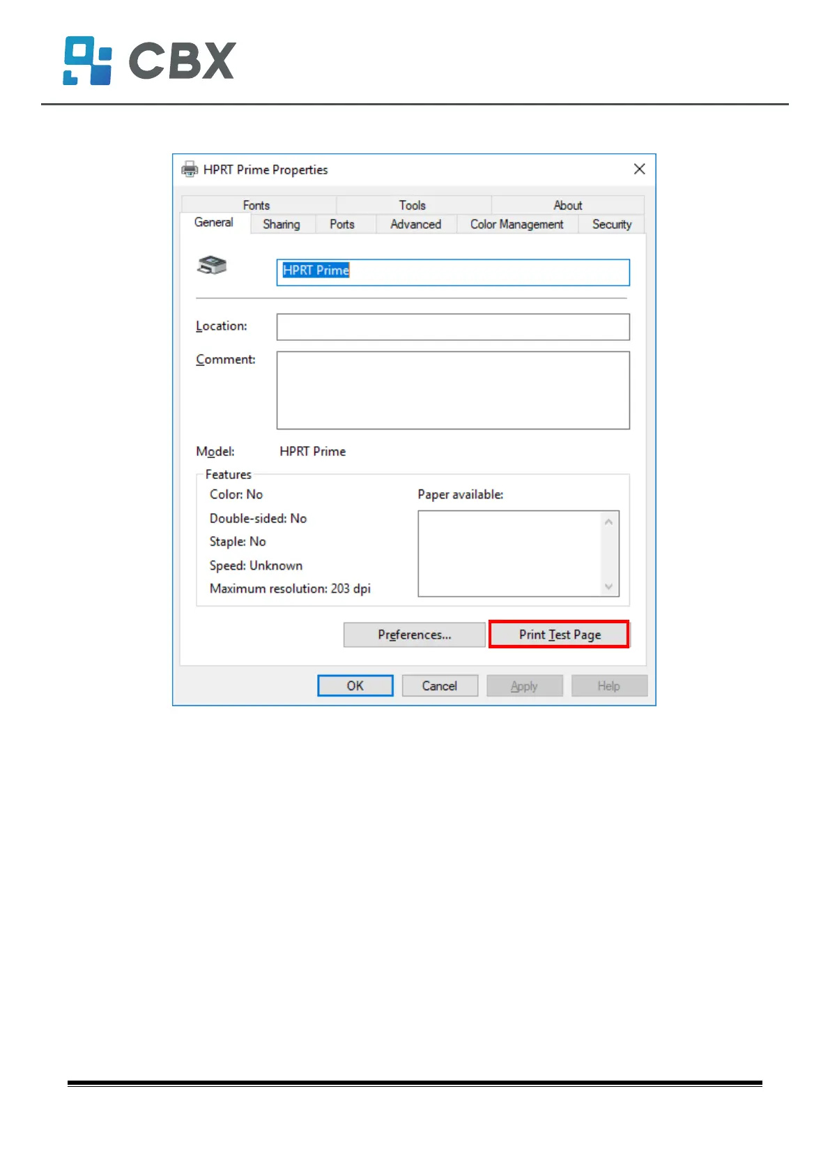2.Click “General” ĺPrint Test Page, and printer will print labels with current settings.