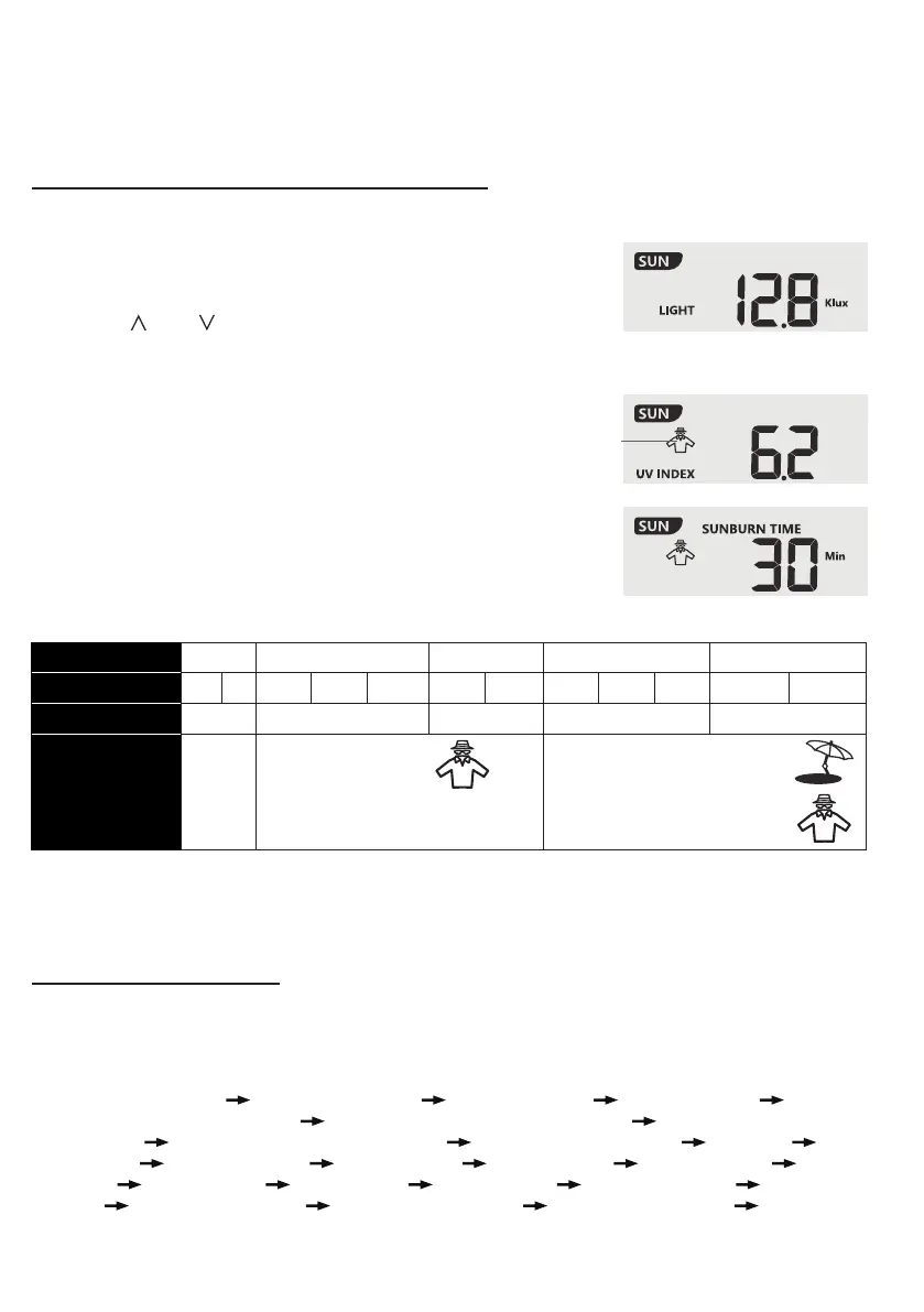 This section of display show the sunlight intensity, UV index and sunburn time. Press the [ SUN ] key to