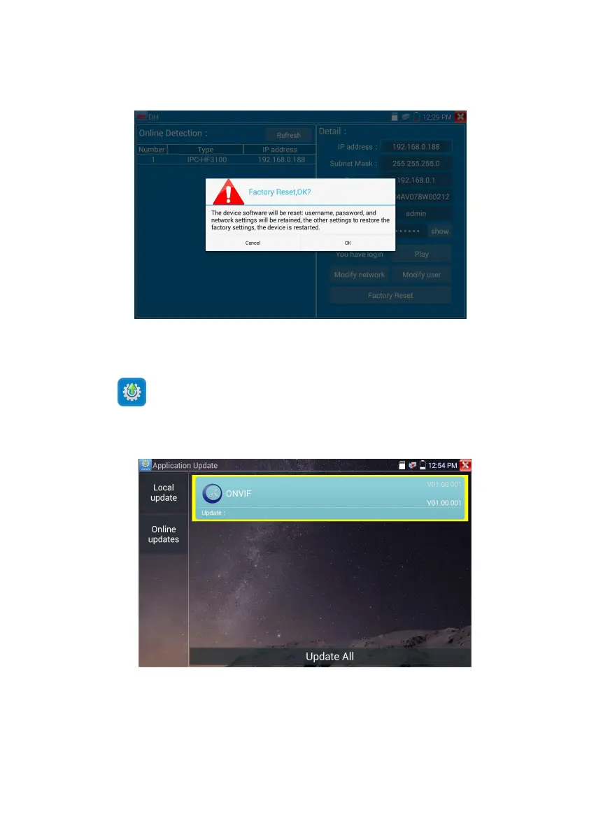 Click the icon to open the Update menu. Select “Local Update” to update via the SD card or
