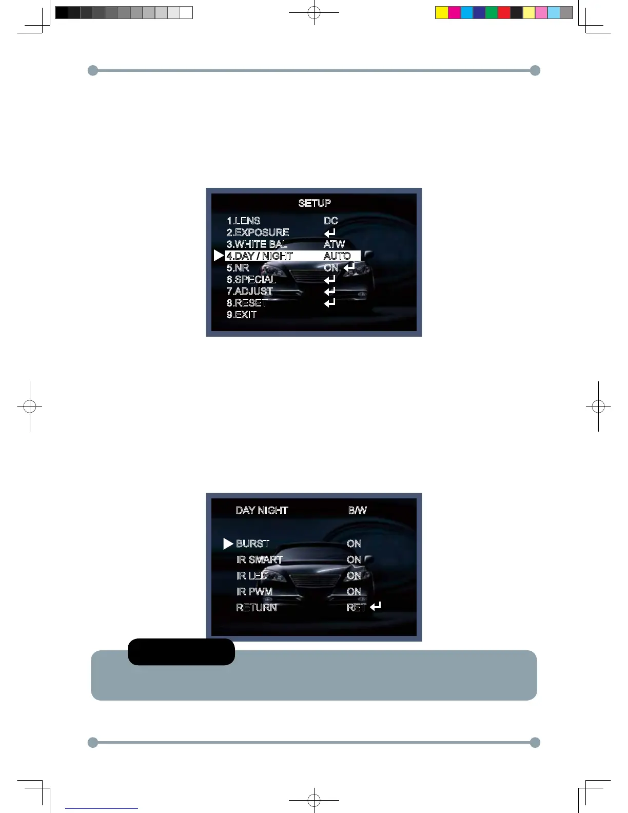 1. Select DAY / NIGHT using the Up or Down button on the SETUP menu screen.