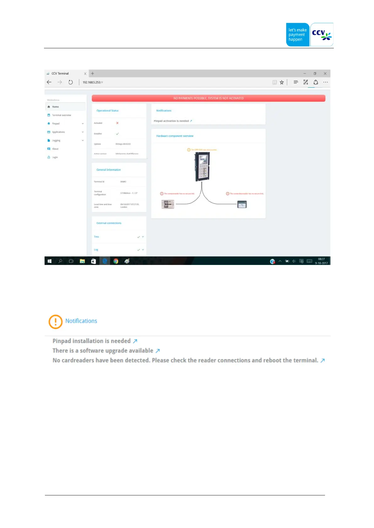 The status of the terminal is shown here, just click on the message and you will be guided to the function to solve that
