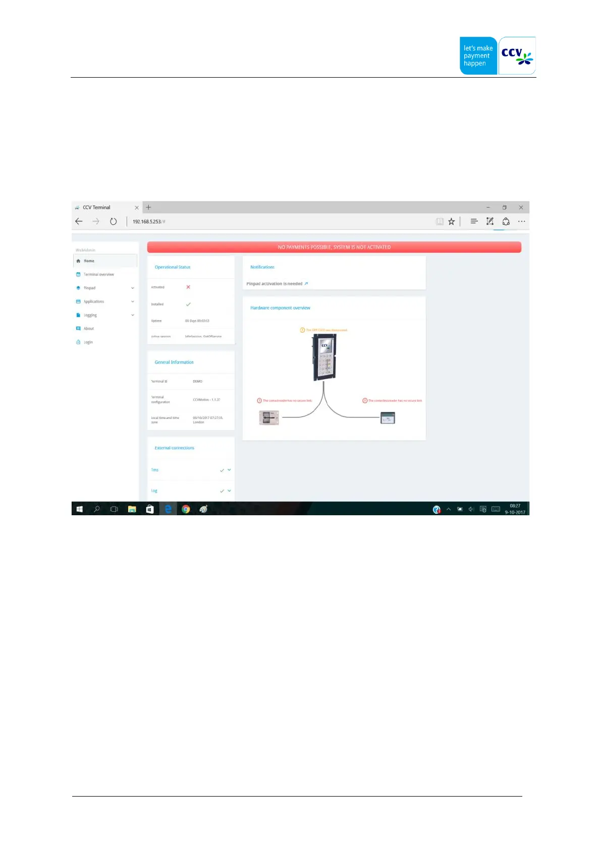 To start the activation just click on that notification text “Pinpad activation is needed” or select the Pinpad page and select