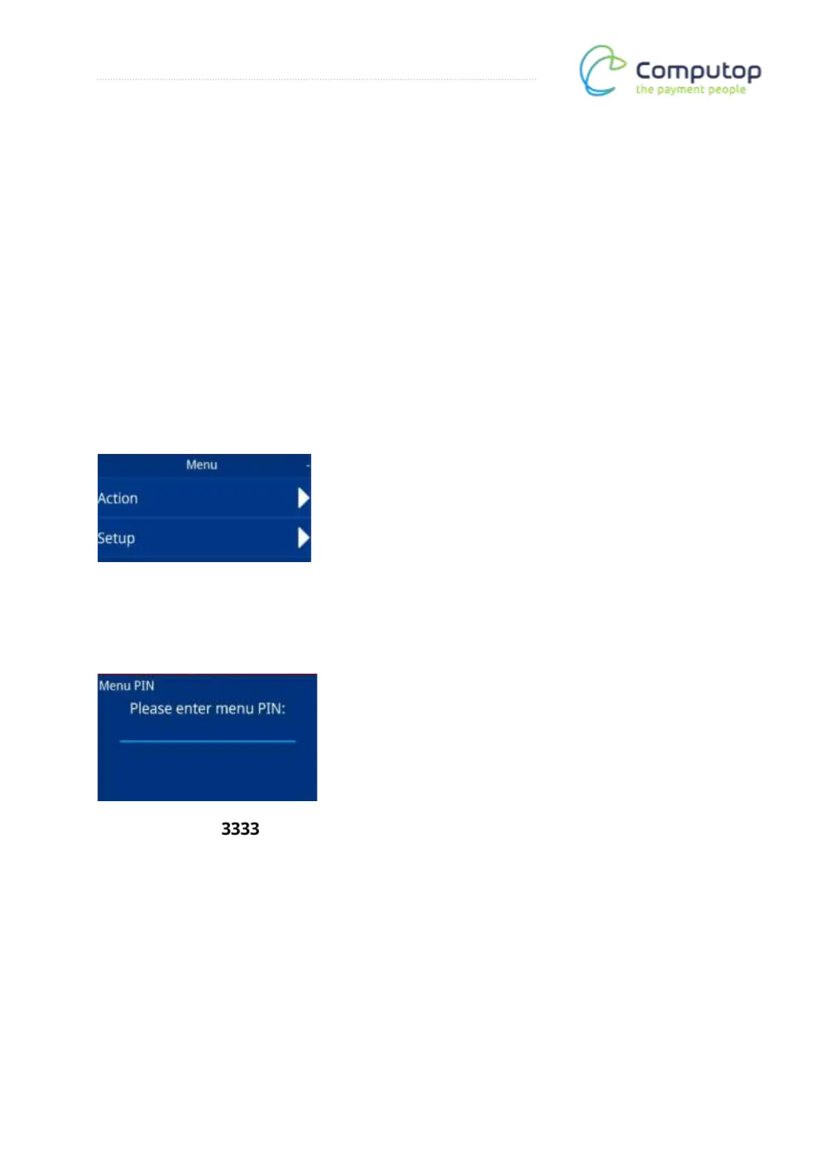 Enter the menu PIN: . The Setup menu is then called up.