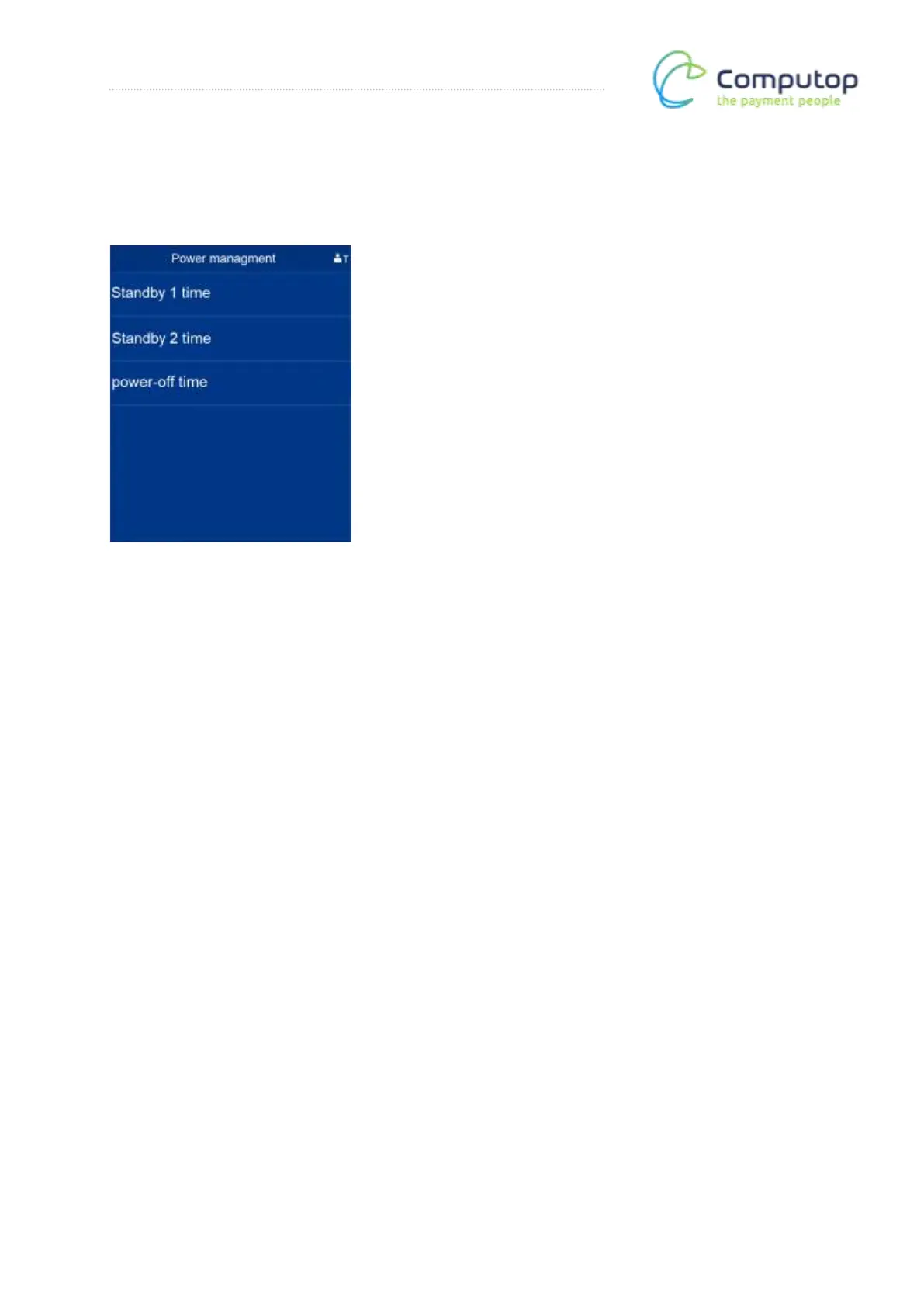 Power-off time: Time specification in minutes until power-off mode. The terminal is shut