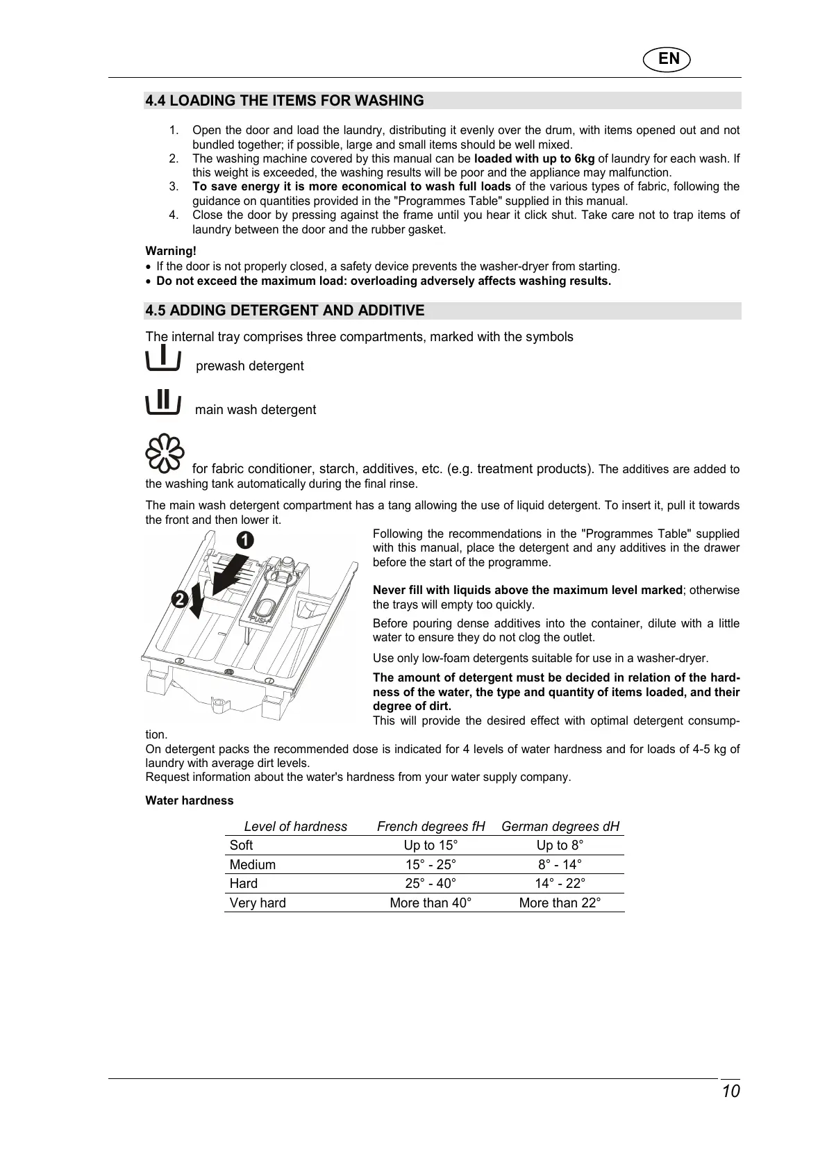 On detergent packs the recommended dose is indicated for 4 levels of water hardness and for loads of 4-5 kg of