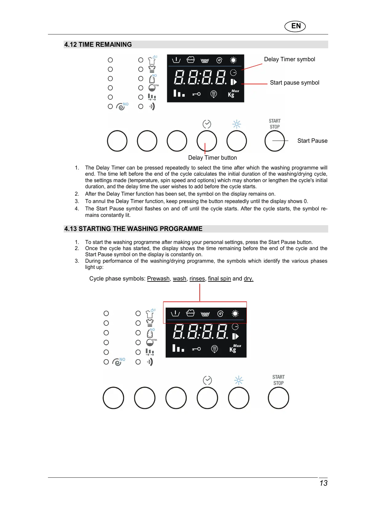 1. The Delay Timer can be pressed repeatedly to select the time after which the washing programme will