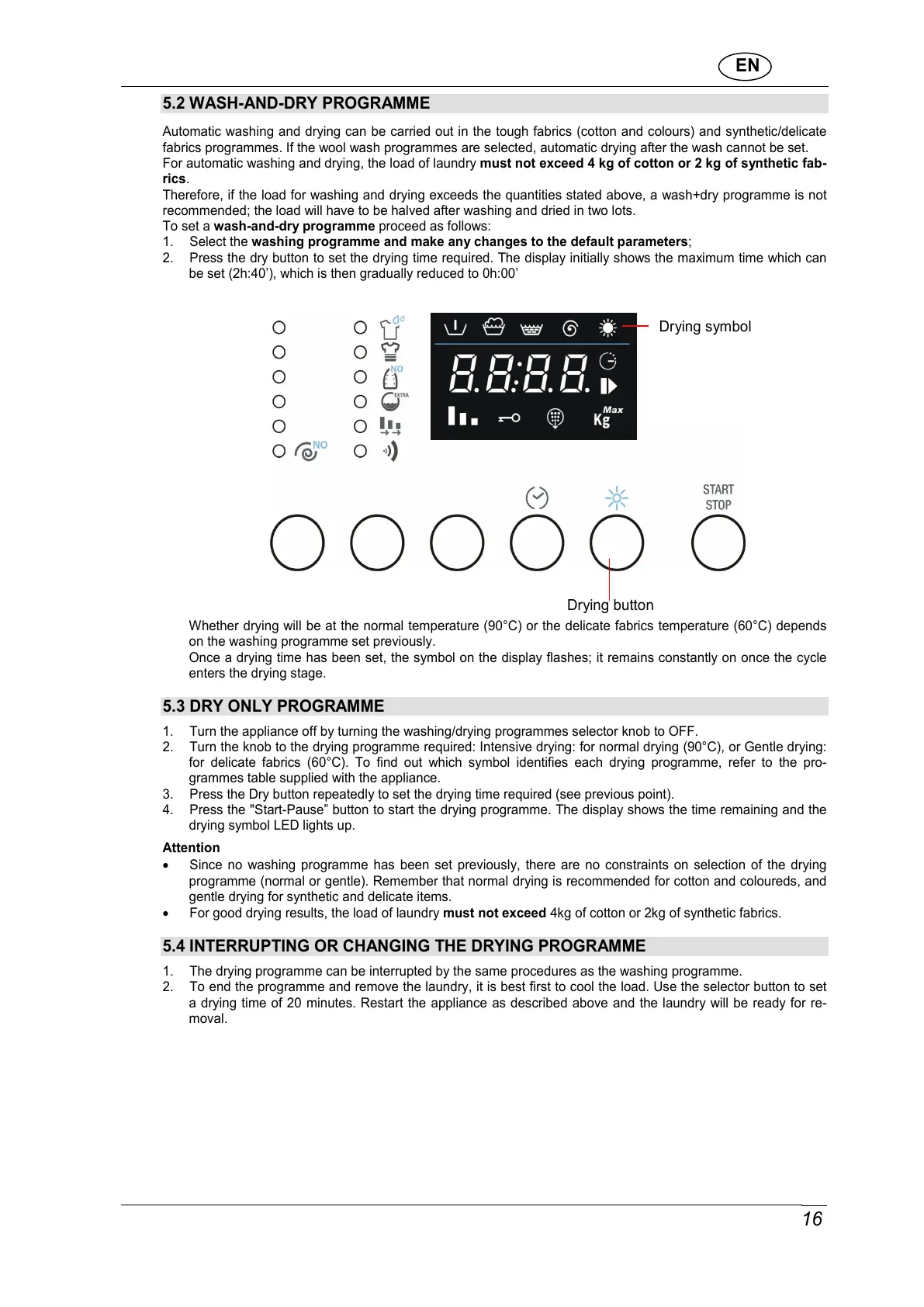 For automatic washing and drying, the load of laundry must not exceed 4 kg of cotton or 2 kg of synthetic fab-