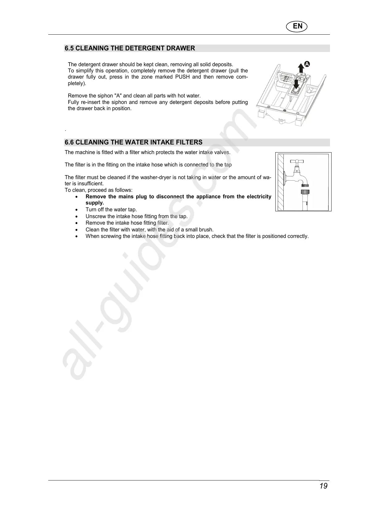 The filter must be cleaned if the washer-dryer is not taking in water or the amount of wa-