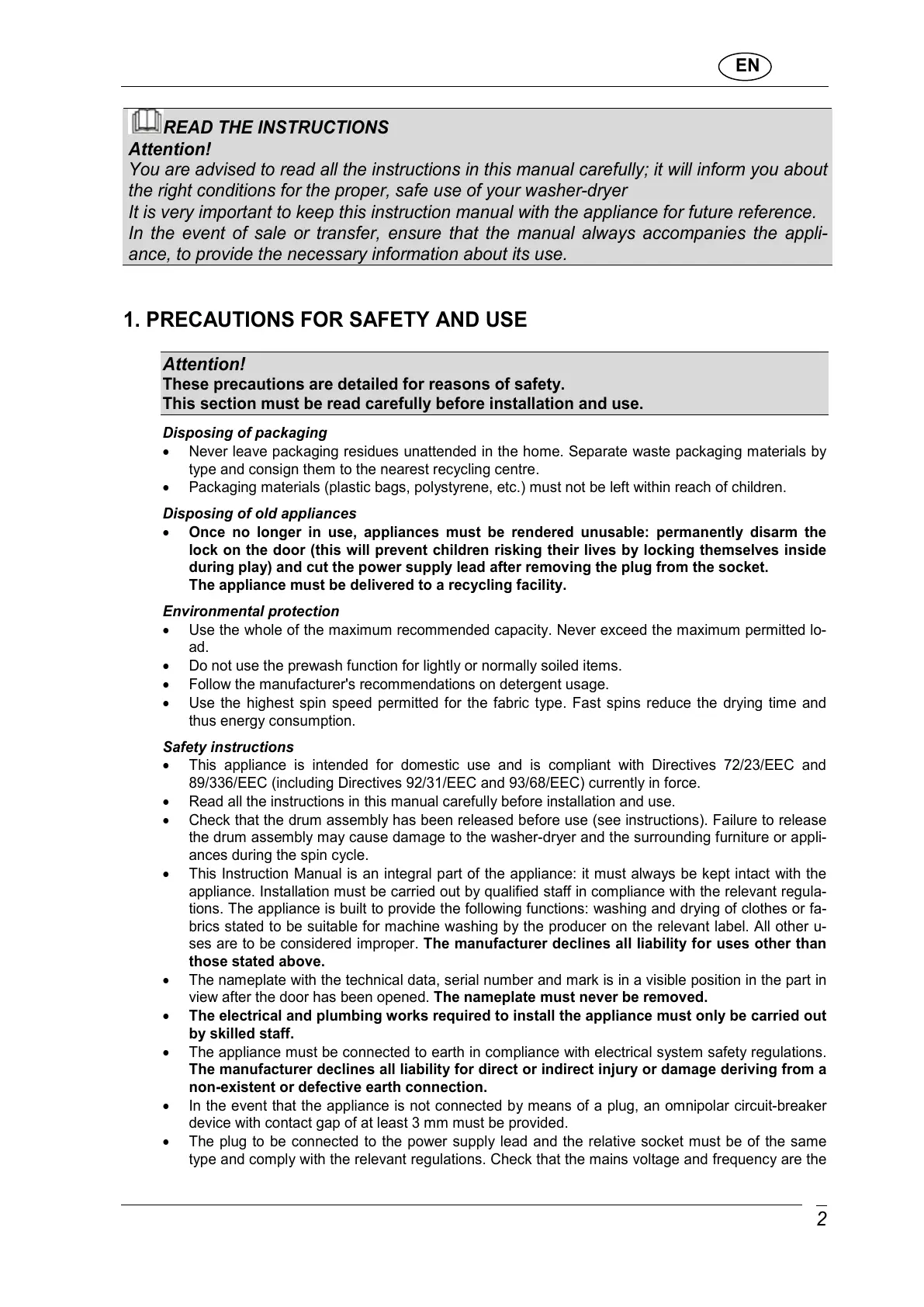 • This appliance is intended for domestic use and is compliant with Directives 72/23/EEC and