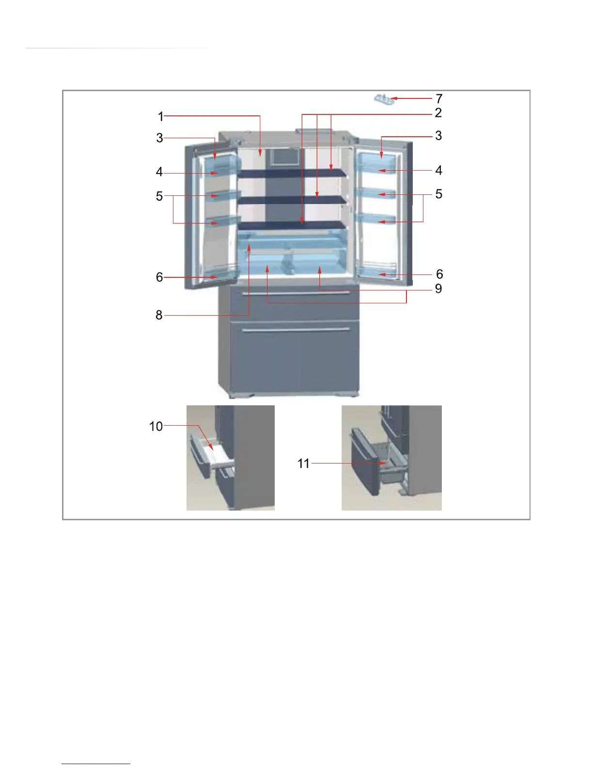 5 - Door shelves 11 - Freezer bottom drawer