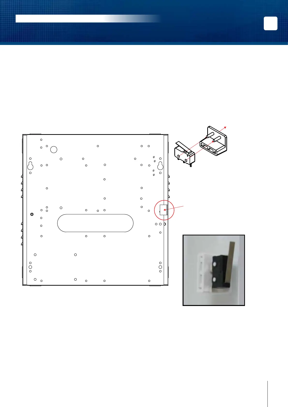 Install the door tamper switch by aligning the switch holes to the pre-installed plastic bracket pins. Press rmly