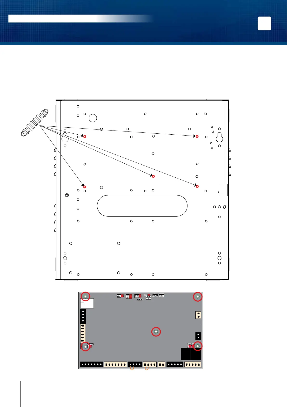 Install the 5 fasteners (PCB holder) supplied respectively to the box holes identied in red in the following