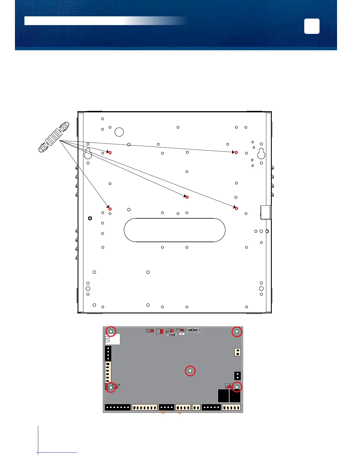 Install the 5 fasteners (PCB holder) supplied respectively to the box holes identied in red in the following