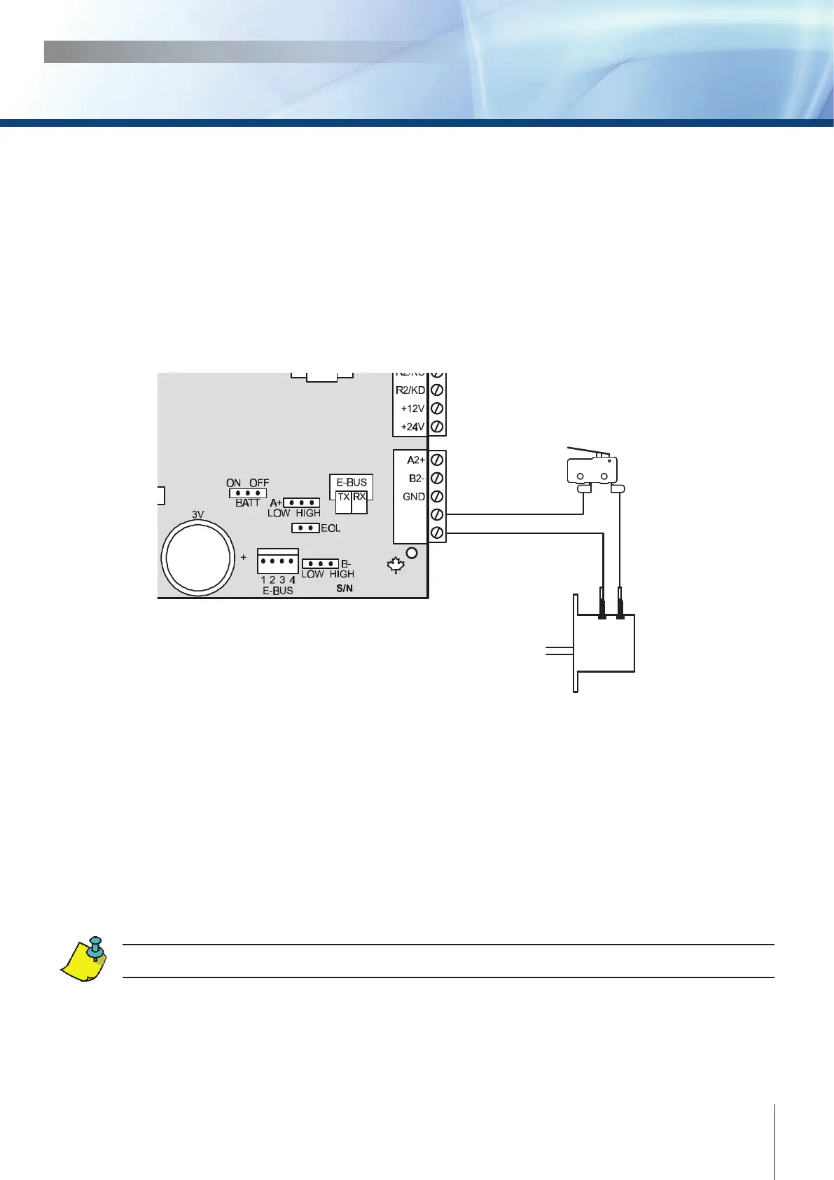 1. Connect one end of the supplied wire, the one with a log at each end, to the door tamper switch