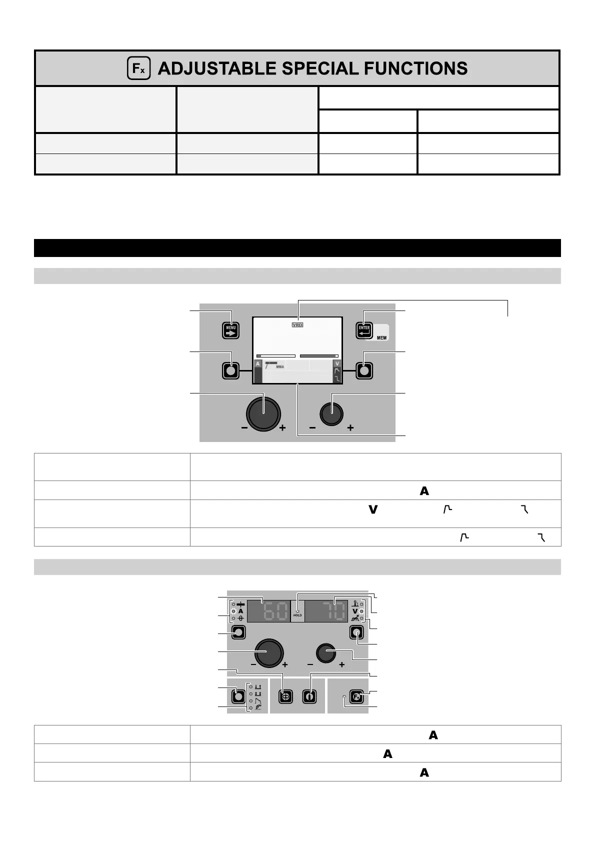 The SPECIAL FUNCTIONS (Fx) related to the MMA process correspond as follows to those on the wire feeder: