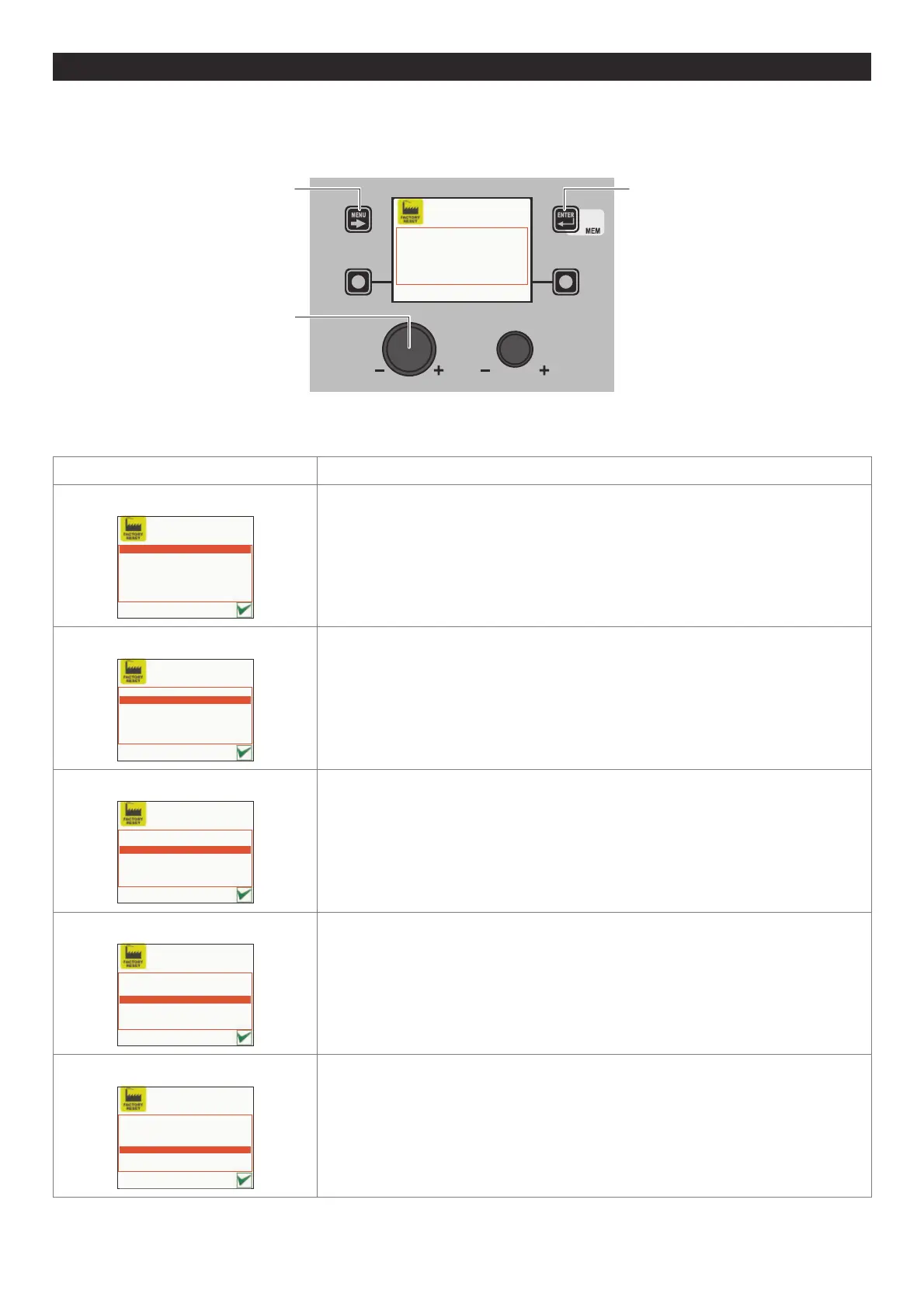 Within the FACTORY RESET Menu it is possible, by rotating the ENCODER KNOB - SX, to select the individual RESET required,