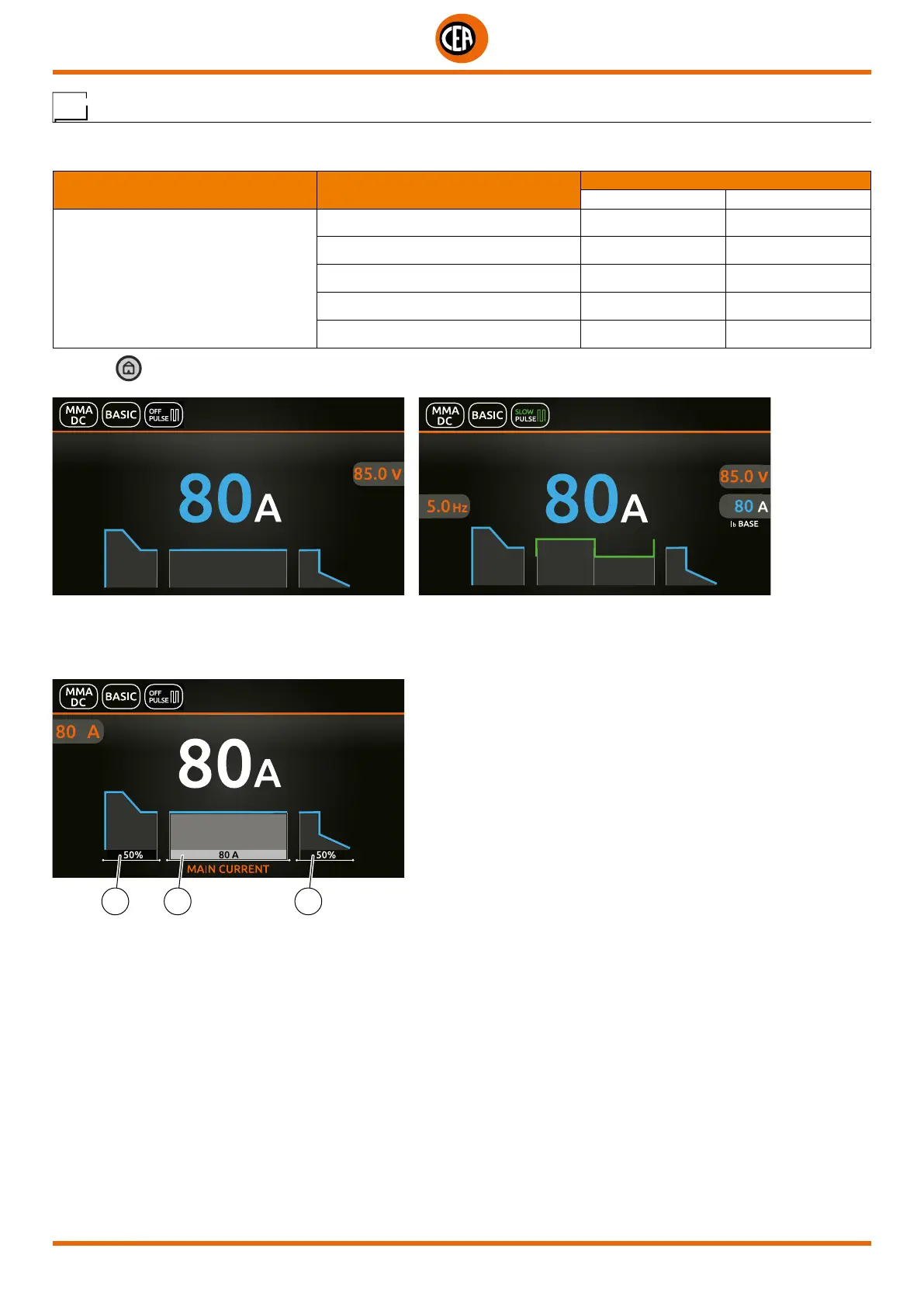 key is pushed, the welding page opens (a configuration is shown below with PULSE OFF and a SLOW PULSE config-