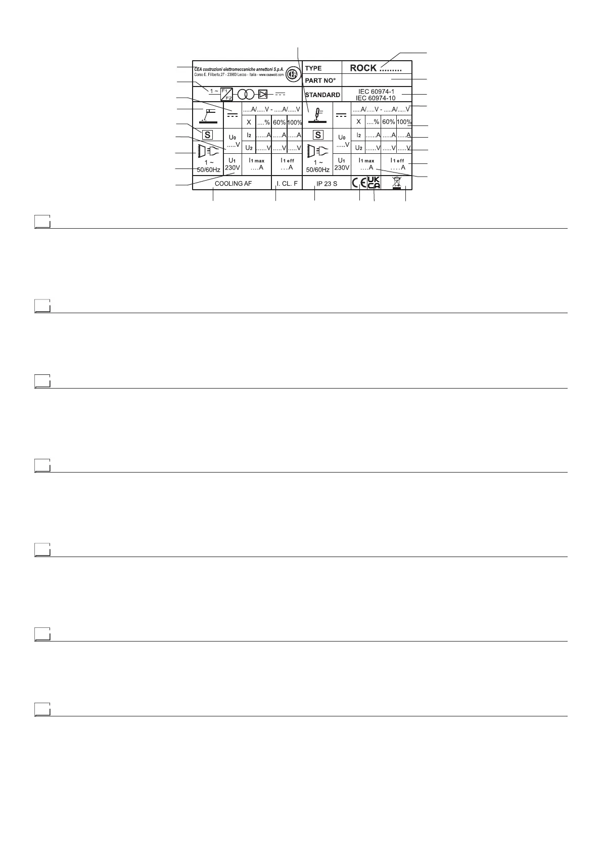 •1 Nome e indirizzo costruttore •2 Denominazione saldatrice •3 Numero di matricola •4 Normativa di riferimento •5 Generatore ad INVERTER monofase