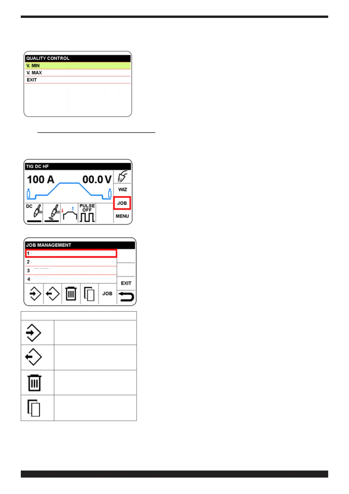 Les paramètres de soudage (procédé, amorçage, mode, etc.) peuvent être mémorisés dans le secteur JOB.
