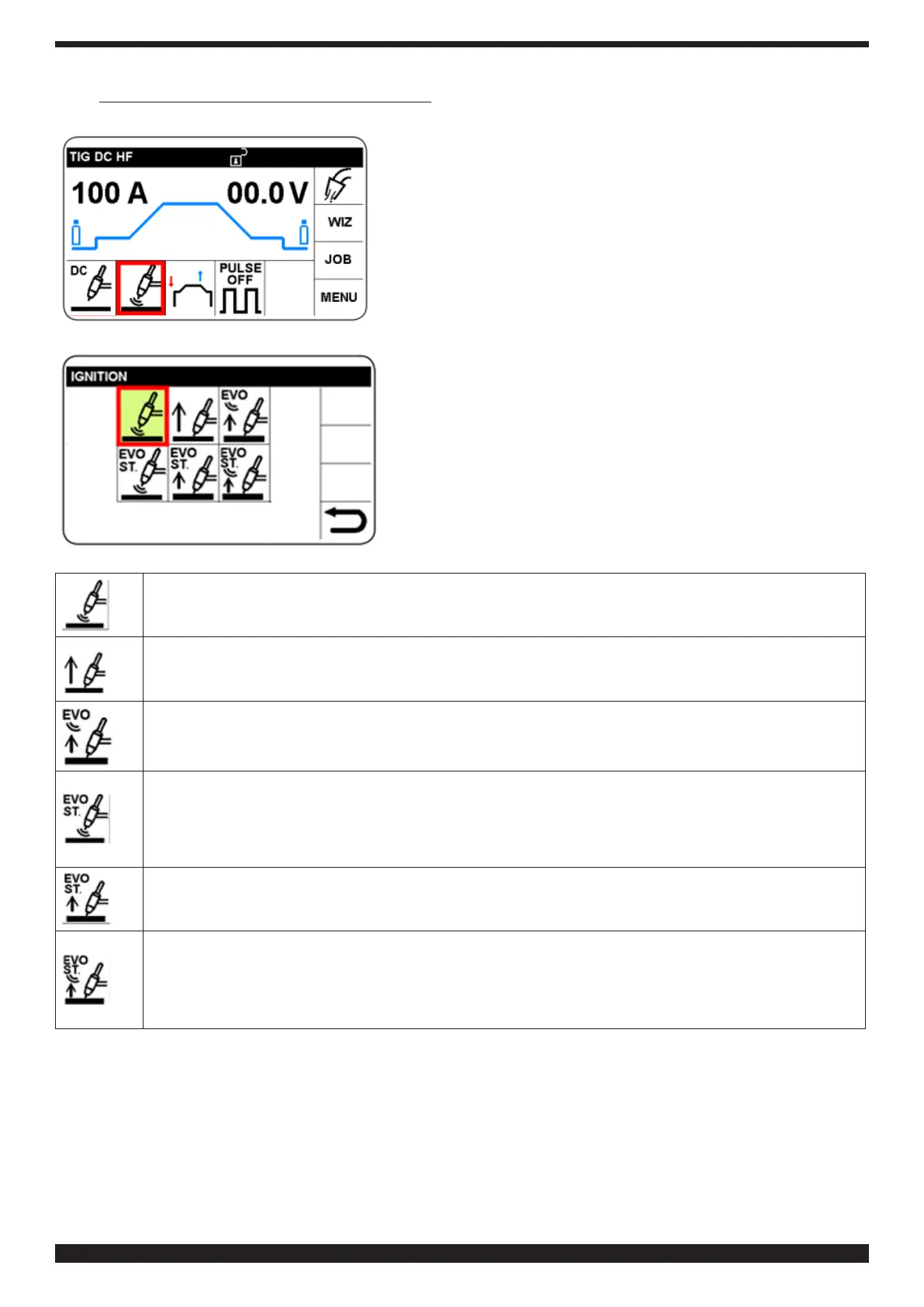 EVO LIFT: Kosketa työkappaletta elektrodin kärjellä, paina polttimen kytkintä ja nosta elektrodin kärki;