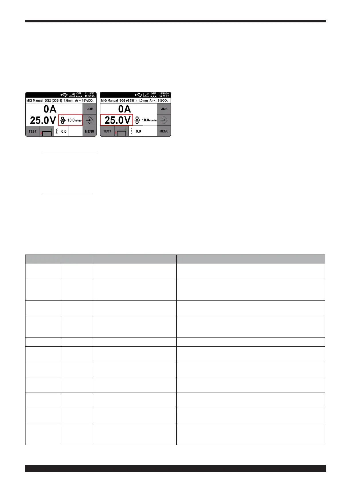 Bisogna impostare i m/min (metri al minuto) del motore. Selezionare la tensione di saldatura visualizzata sul display,