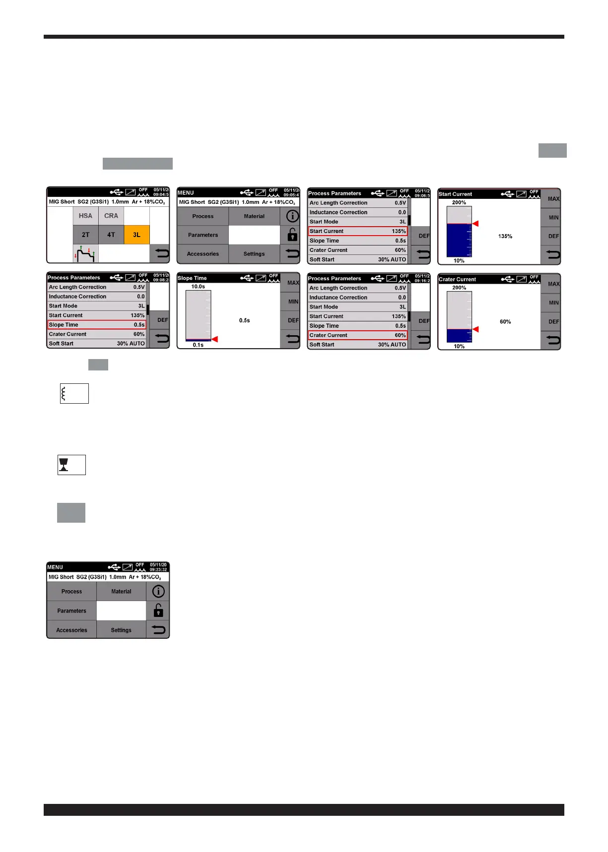 To adjust start current, connection time and crater current values, enter the main menu by pressing key F