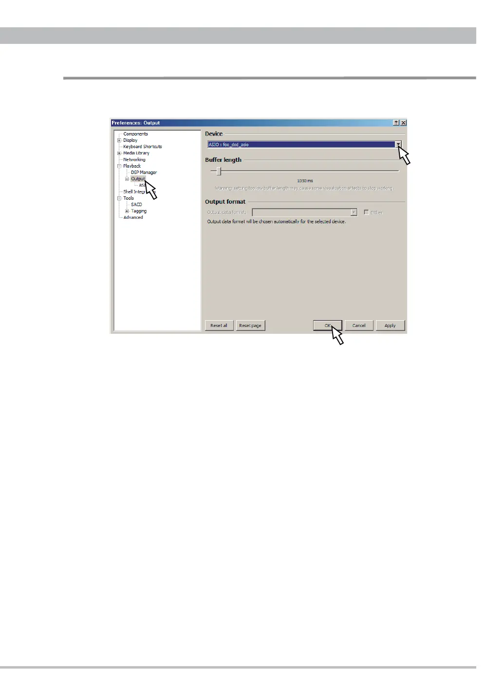 5.5. Click "Playback - Output" at the left side tree and select "ASIO:foo_dsd_asio" at