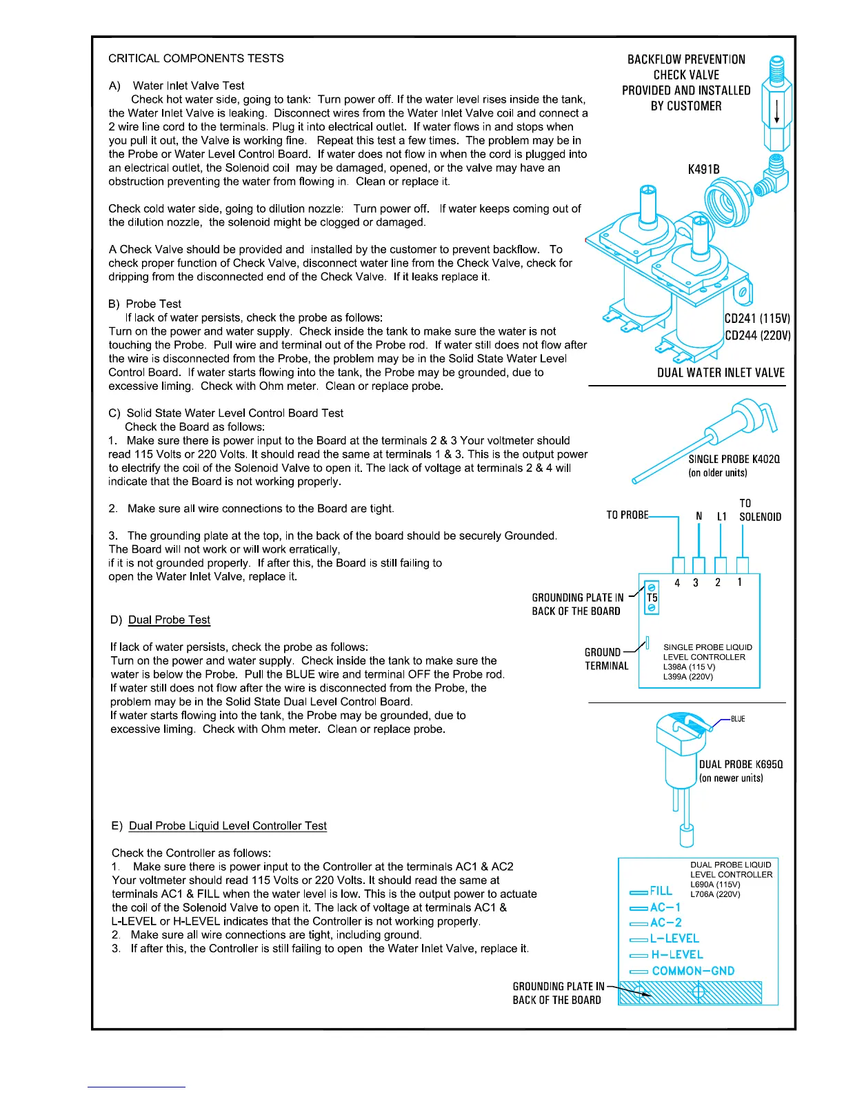Cecilware FTC-3-N - CRITICAL COMPONENT TESTING PROCEDURES; WATER INLET VALVE FUNCTIONALITY TEST; WATER LEVEL PROBE TESTING; WATER LEVEL CONTROL BOARD TESTING