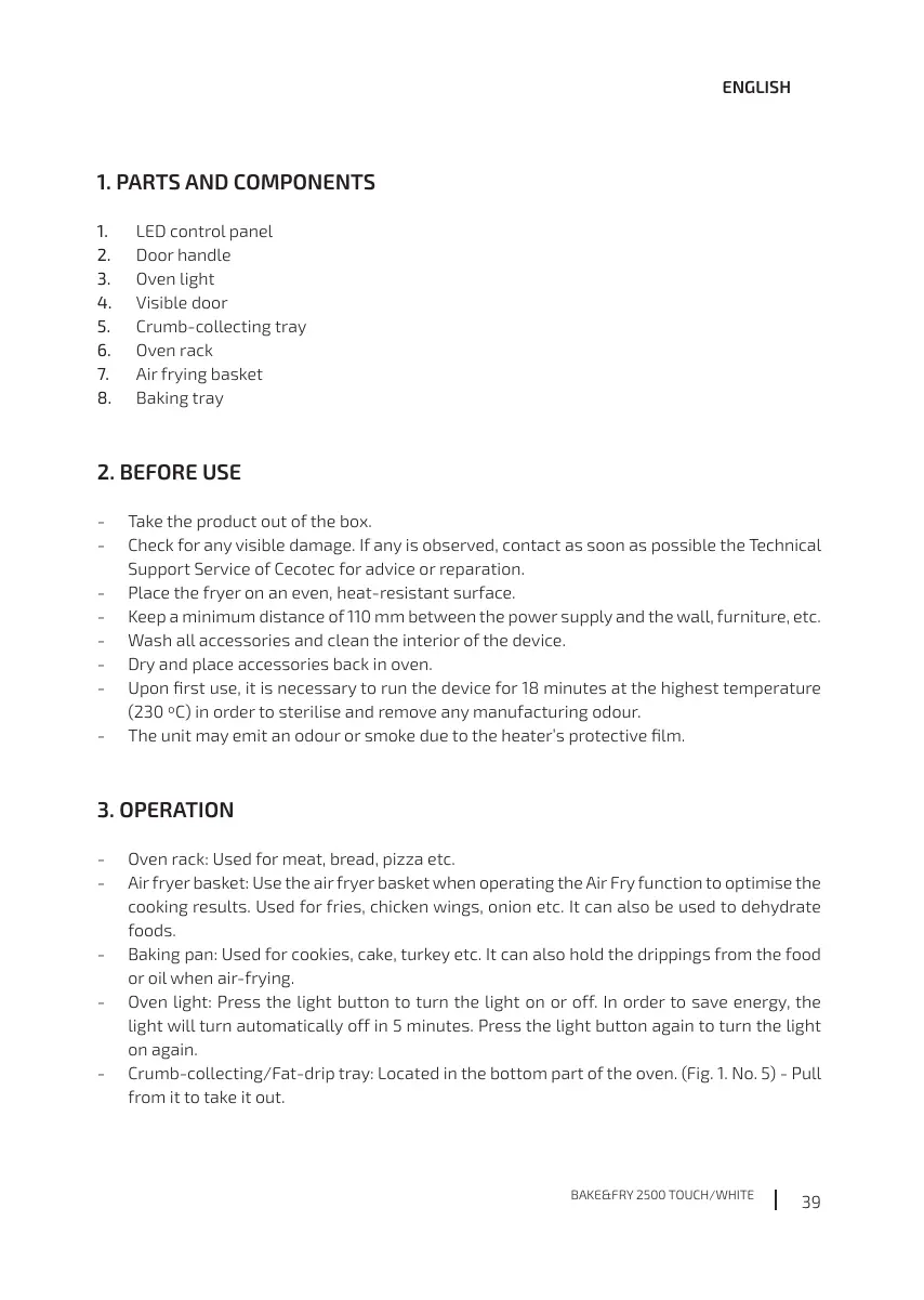 - Oven light: Press the light button to turn the light on or off. In order to save energy, the