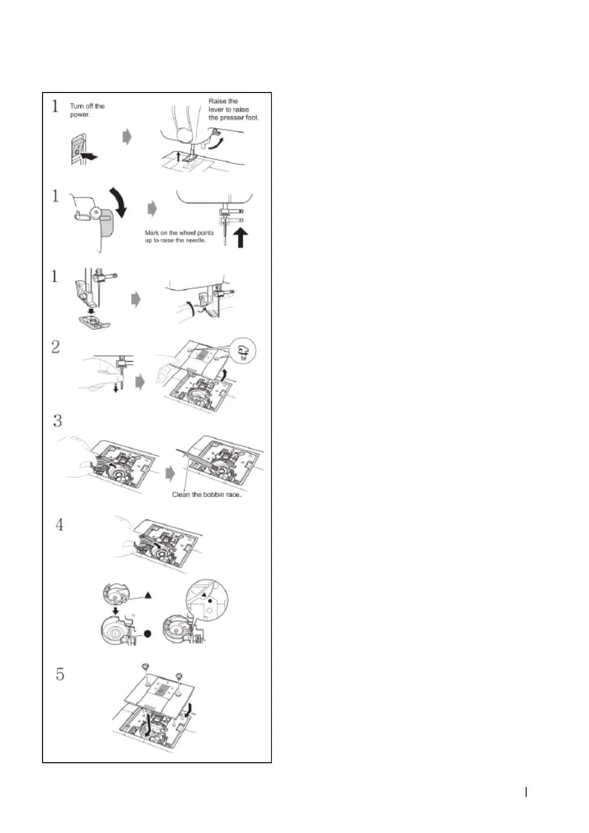 3. Remove the bobbin case. Clean the feed dogs and hook area with a lint brush. Put a drop of lubricating oil for sewing machines on the