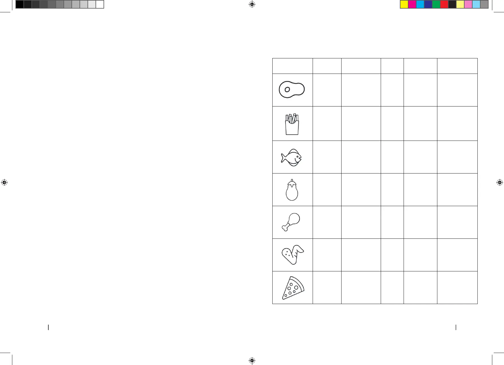 The table below shows the basic settings for the ingredients you want to prepare.