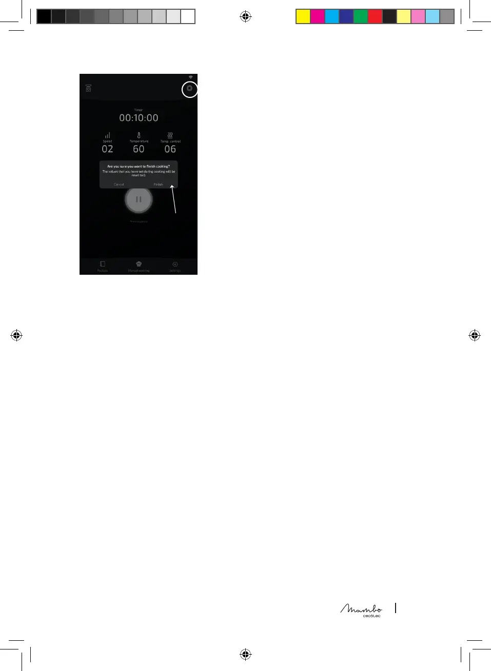 canto superior direito do ecrã. Prima-o e a opção de cancelar ou terminar a cozedura aparecerá