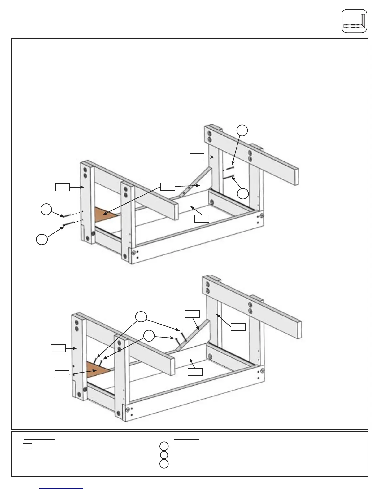 each front (010) Box Leg using 1 (S15) #8 x 1-3/4” Wood Screw in the top hole and 1 (S3) #8 x 2-1/2” Wood